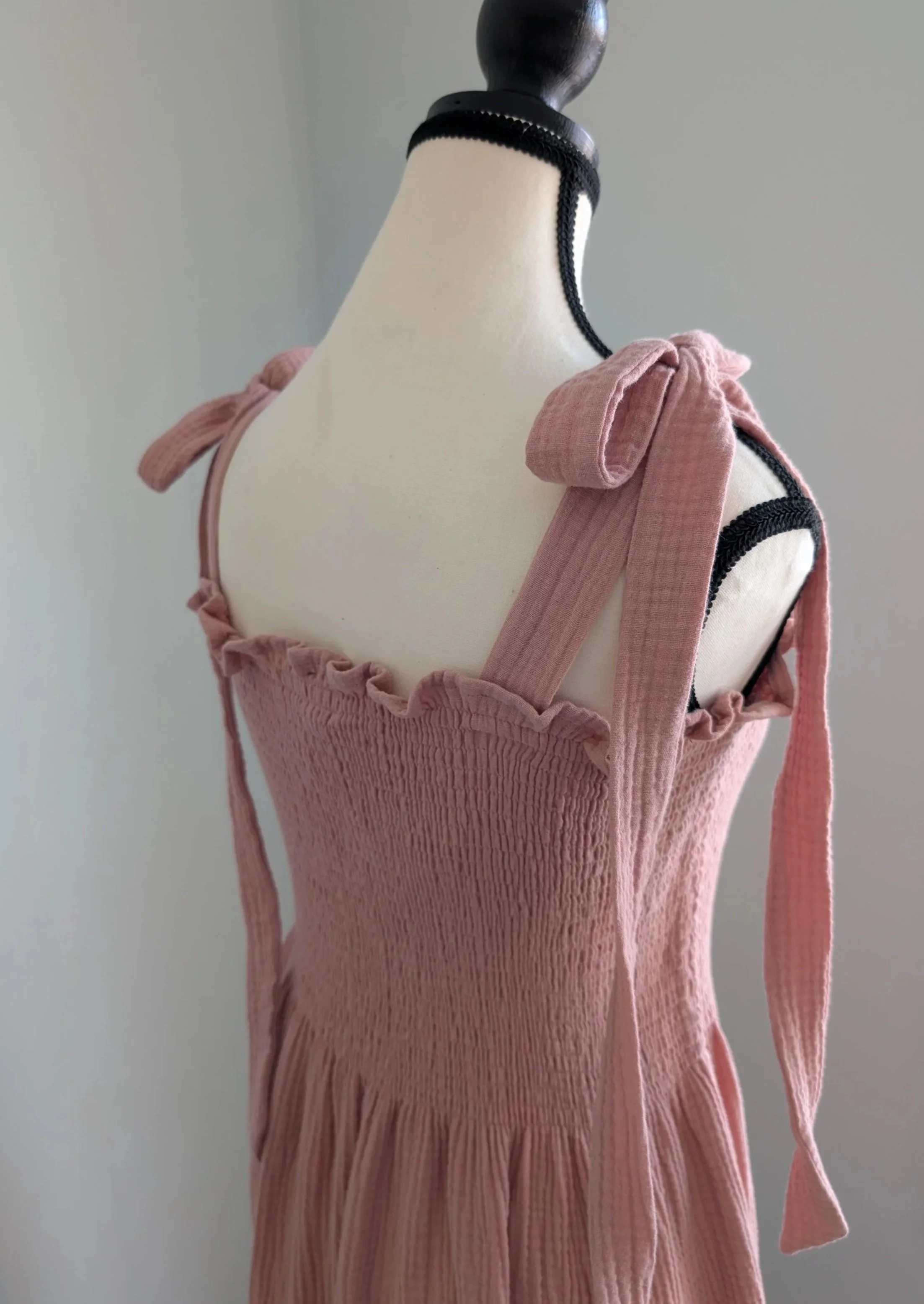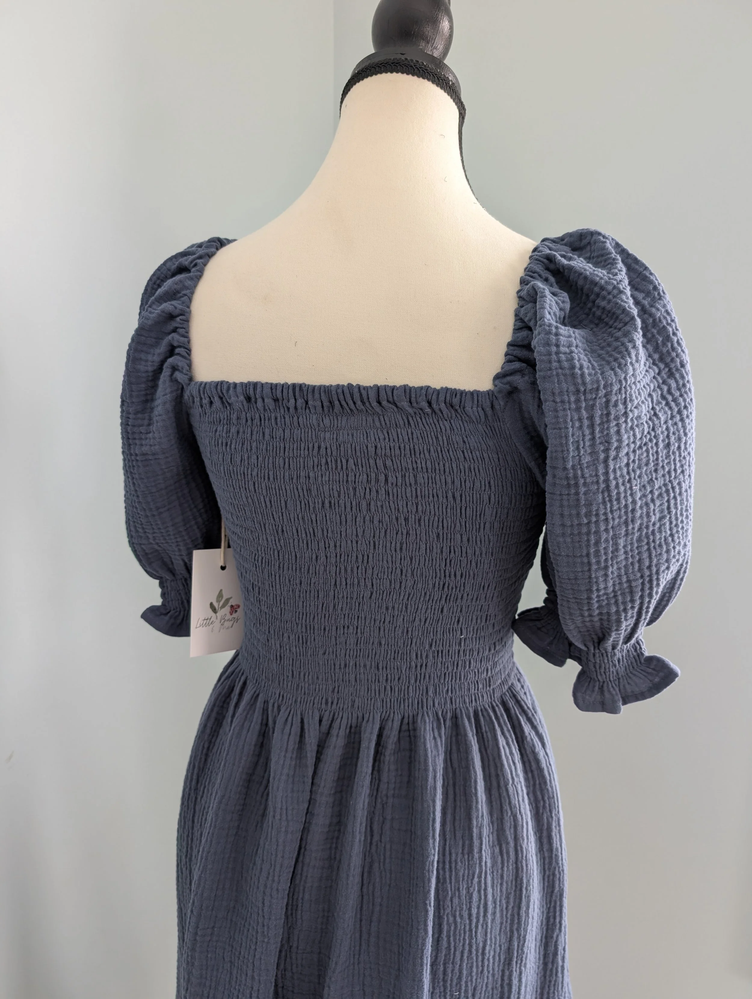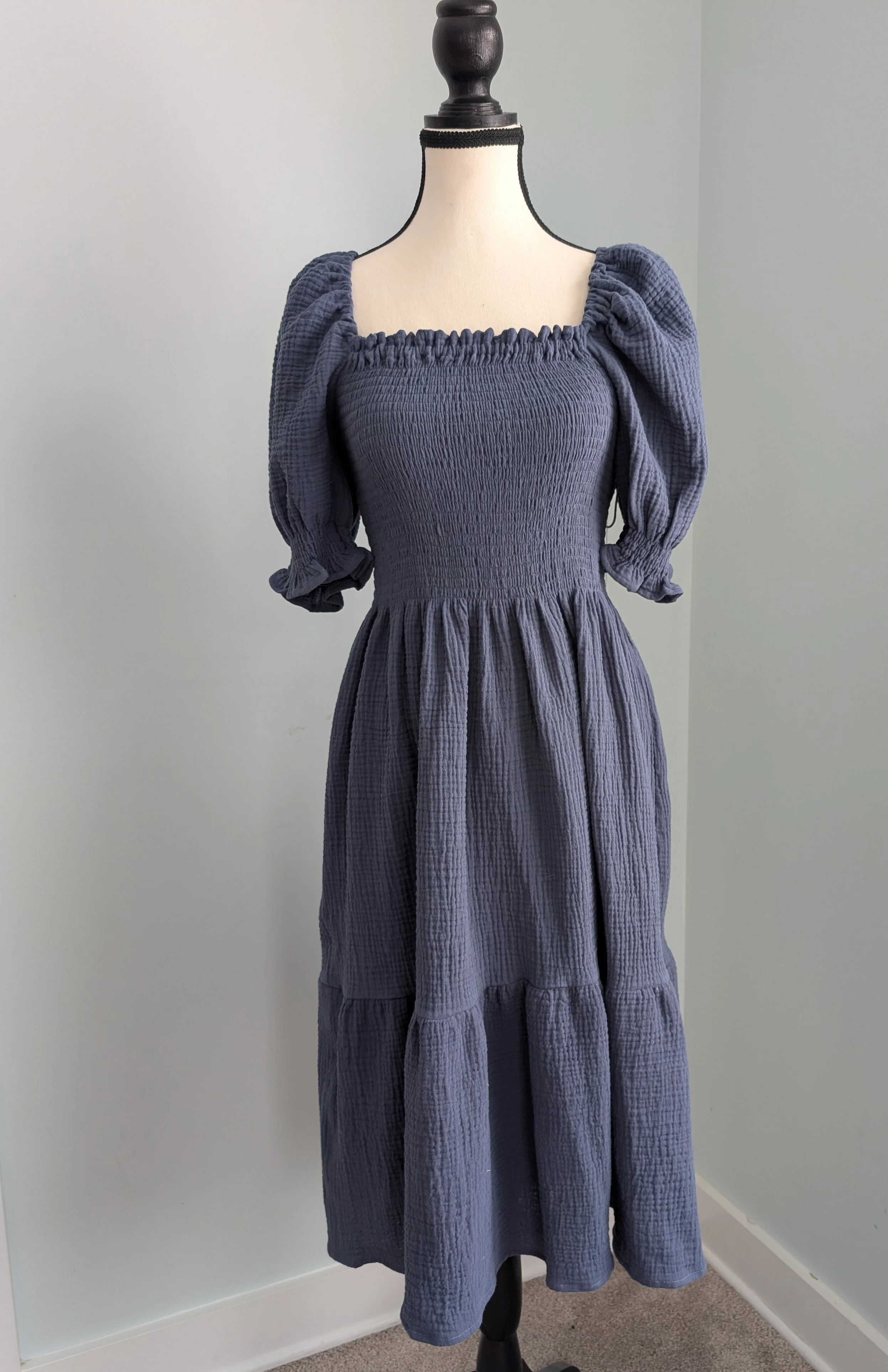 This beautiful midi length dress features puff sleeves that can be worn as traditional sleeves or off the shoulder. It features our beloved shirred bodice that allows for this dress to fit through many transitions of life, including maternity and nursing.