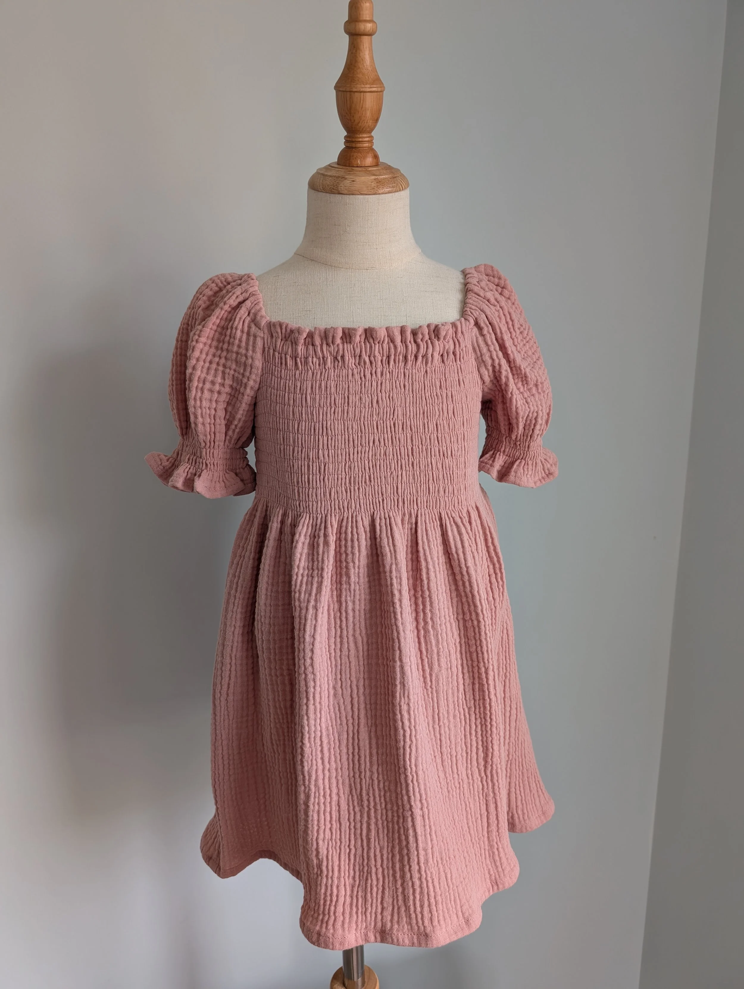 This beautiful knee length dress features a shirred bodice with a sweet ruffle along the top, and adorable puff sleeves. Worn with sandals or tights, this dress will last your little one for multiple seasons.
